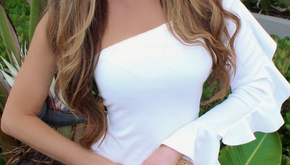 Red two piece dress with ruffle flair at hem