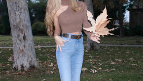 Cool Spring - Light Grey Striped Long Sleeve Sweater, Flared Denim Jeans and Lavender Chuck Sneakers